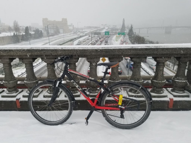 This week in the city we actually got some snow, perfect for taking the bike path less traveled! For those of you following from other parts of the country/world I realize this won’t look like much. However in the City of Portland this is actually a big deal. As soon as word spread that this was coming the shutdown began. While the Northwest mountains receive a ton of snow, the city itself is more mild. Yes it does rain most of the winter, but the temperature hovers around 40F which avoids the snow at our level. This is why urban bike commuting is an option 365 days a year.